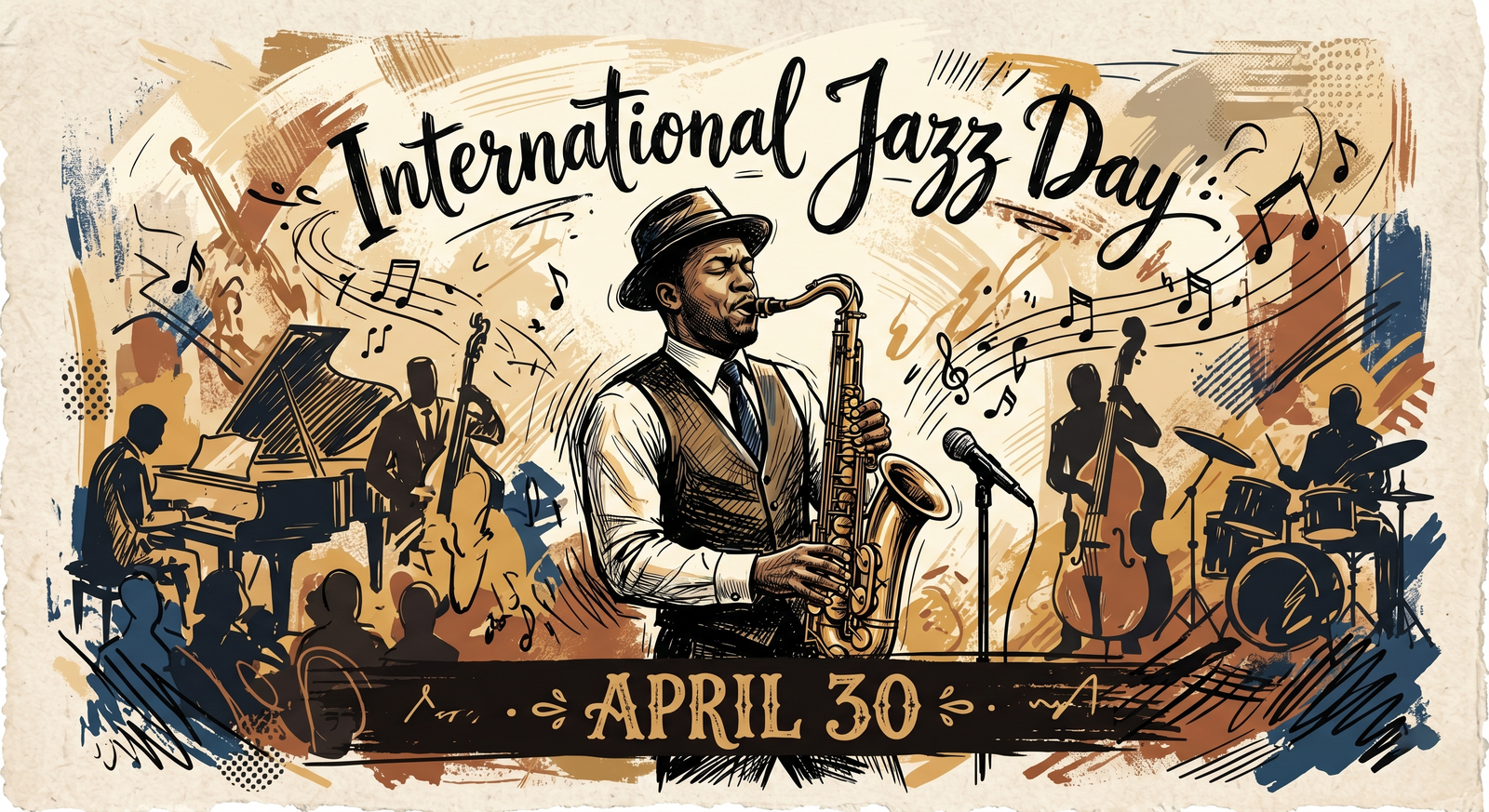 Download this high-quality Jazz Music Artistic Illustration image, perfect for international jazz day 2026, social media posts, festival greetings, event designs, banners, and creative projects. Clean quality, ready to use, and easy to customize.