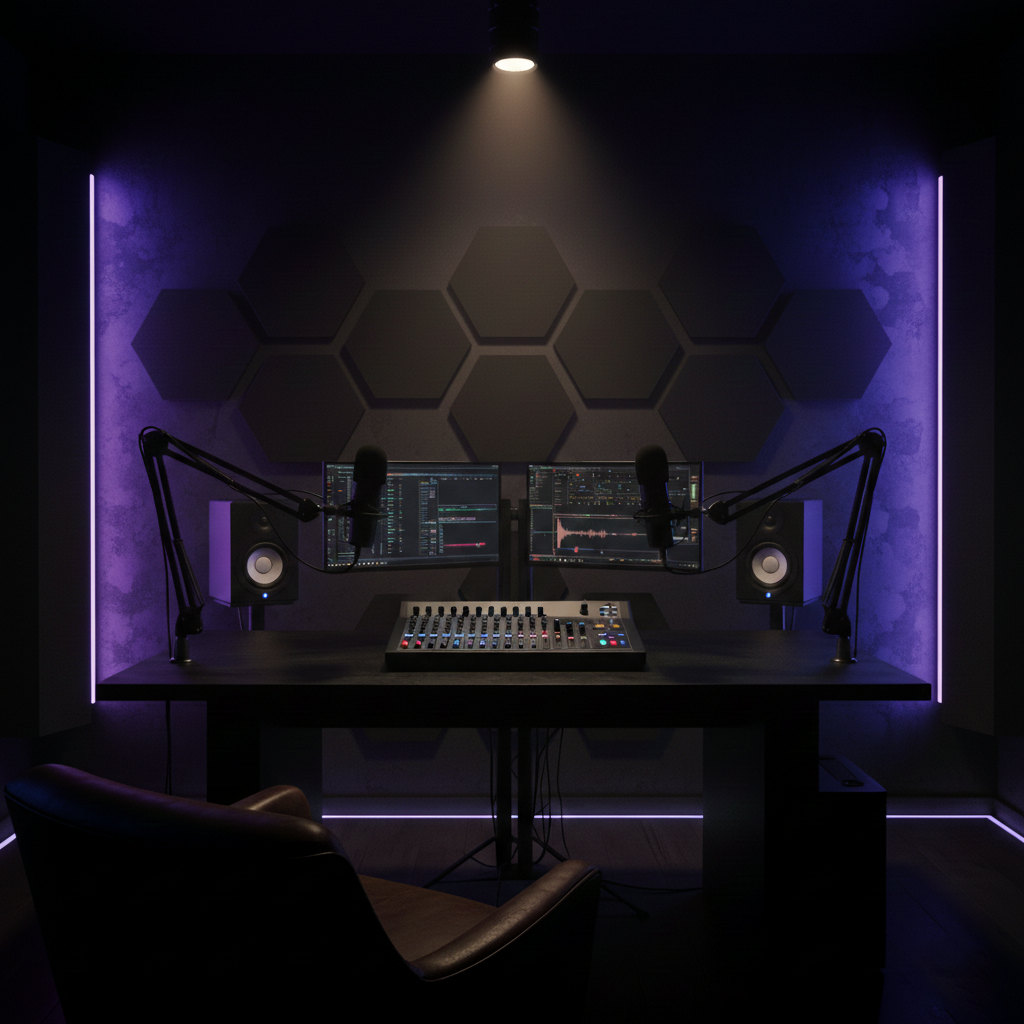 Download this high-quality Podcast Studio Background With Sound Mixing Desk image, perfect for podcast studio background, social media posts, festival greetings, event designs, banners, and creative projects. Clean quality, ready to use, and easy to customize.