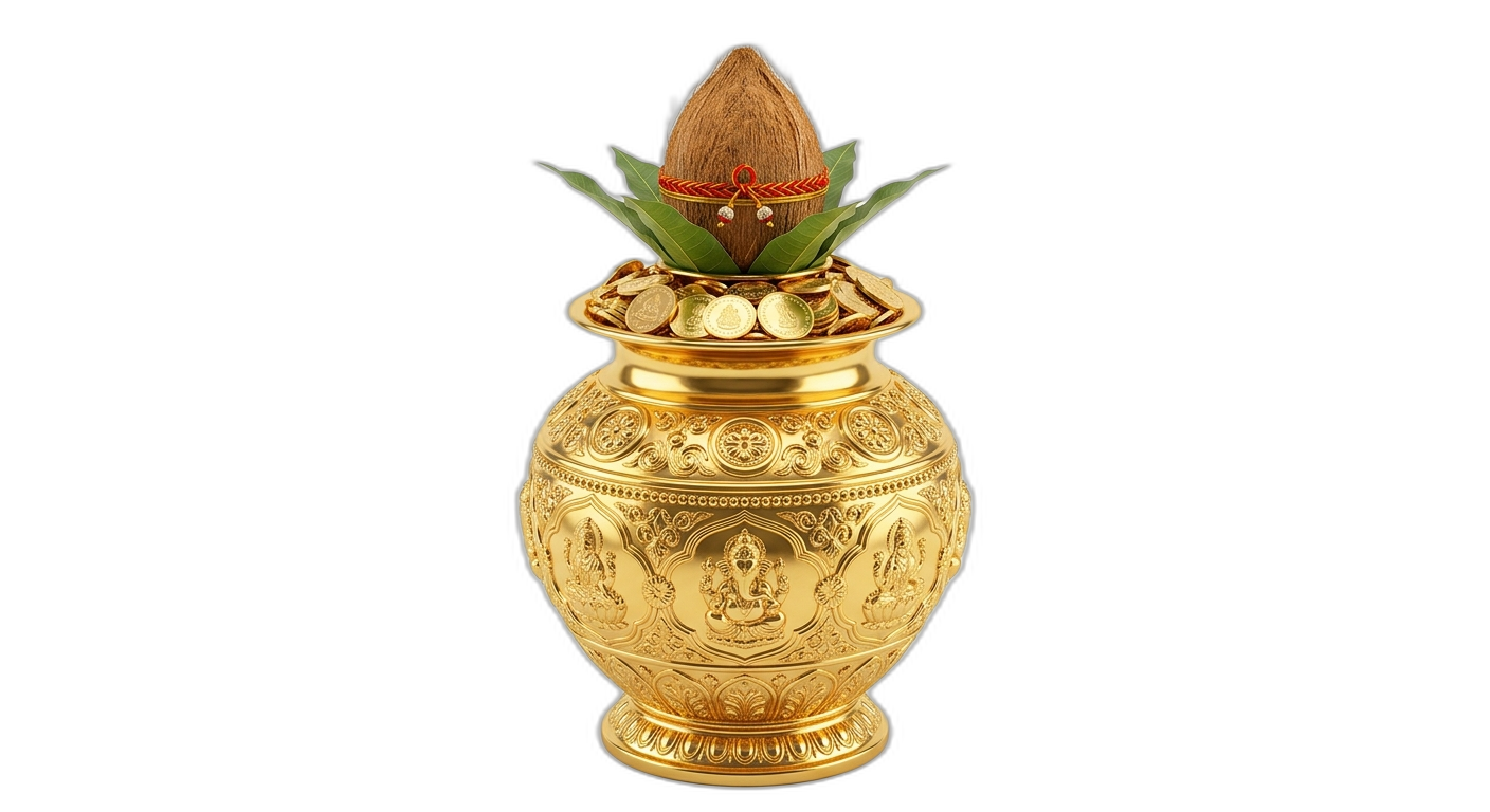 Download this high-quality Png Image Of Kalash With Gold Coins And Coconut image, perfect for golden puja kalash with gold coins png, social media posts, festival greetings, event designs, banners, and creative projects. Clean quality, ready to use, and easy to customize.