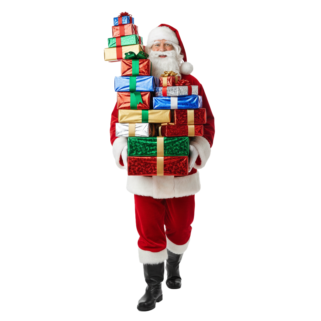 Download this high-quality Santa Claus With Christmas Tree And Gifts Png image, perfect for santa claus with gifts png, social media posts, festival greetings, event designs, banners, and creative projects. Clean quality, ready to use, and easy to customize.