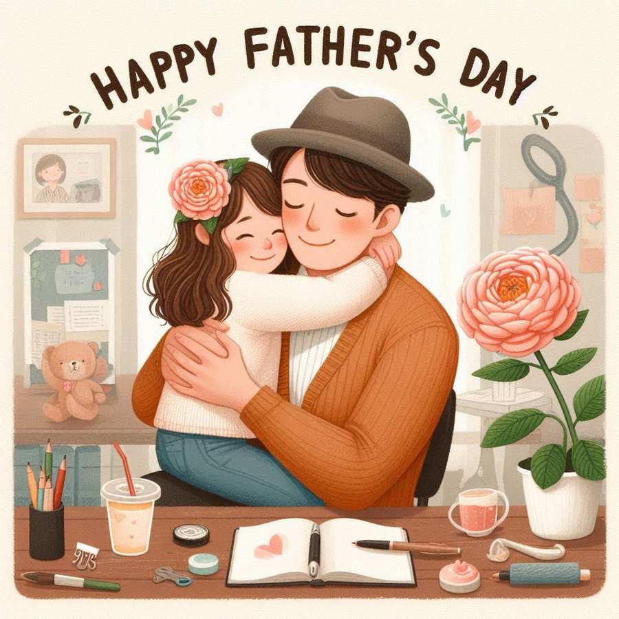 Happy Fathers Day With A Flower, A Father, And His Daughter Hugging