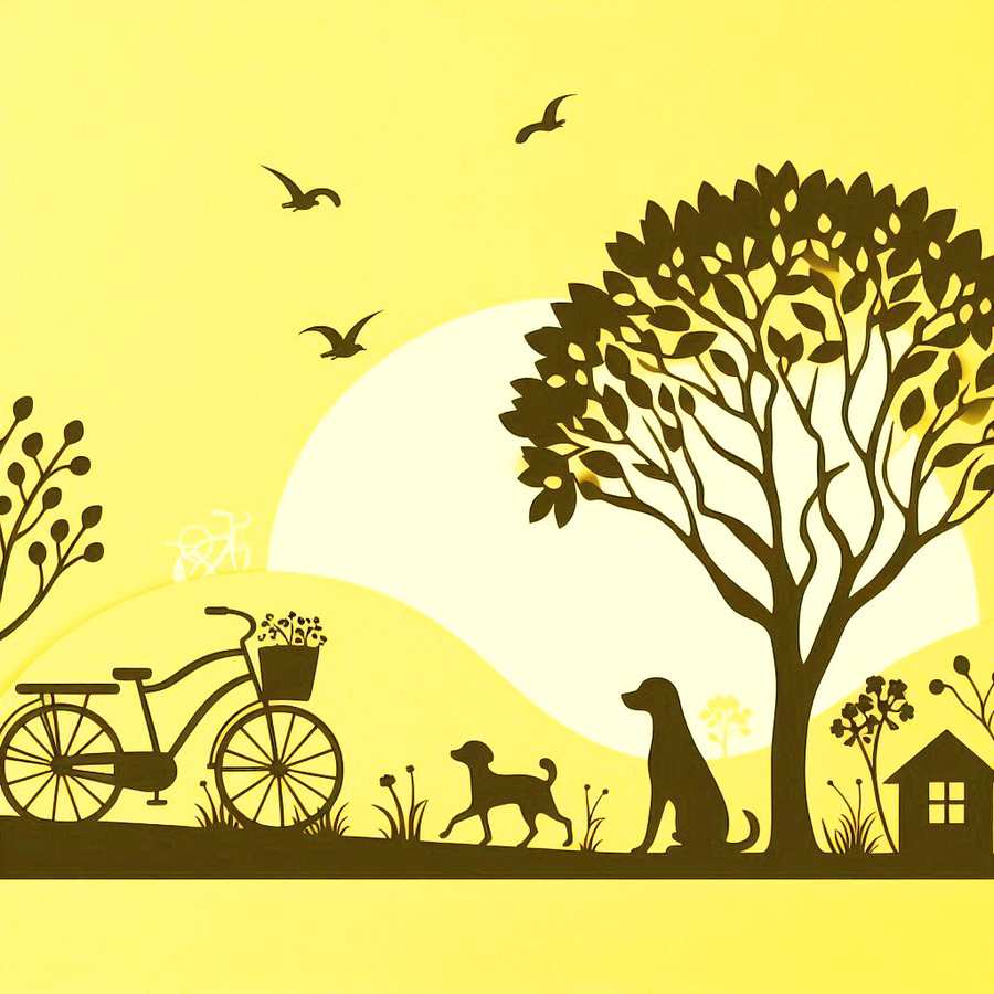 Tree Dog And Bicycle On Light Yellow Background
